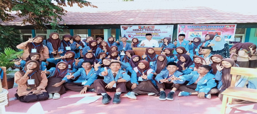 Foto Bersama Kepala Sekolah Bapak H.Suratman,SH, M.Pd dengan Guru Pembina dan Paslon Ketua - Wakil Ketua OSIS SMP Negeri 39 Jakarta sesudah melaksanakan Debat Terbuka Agustus 2023